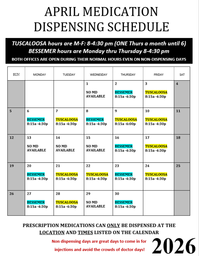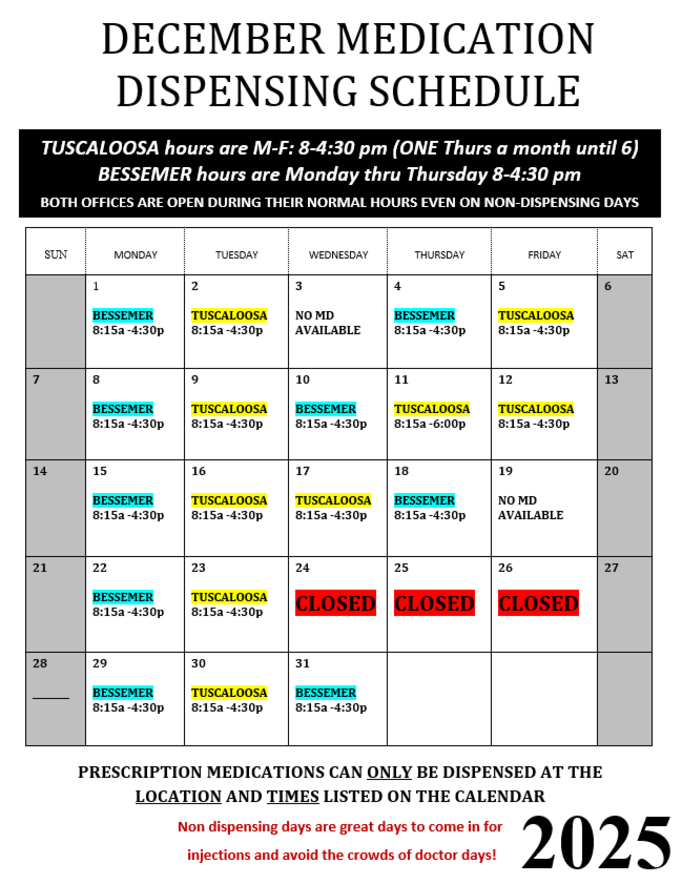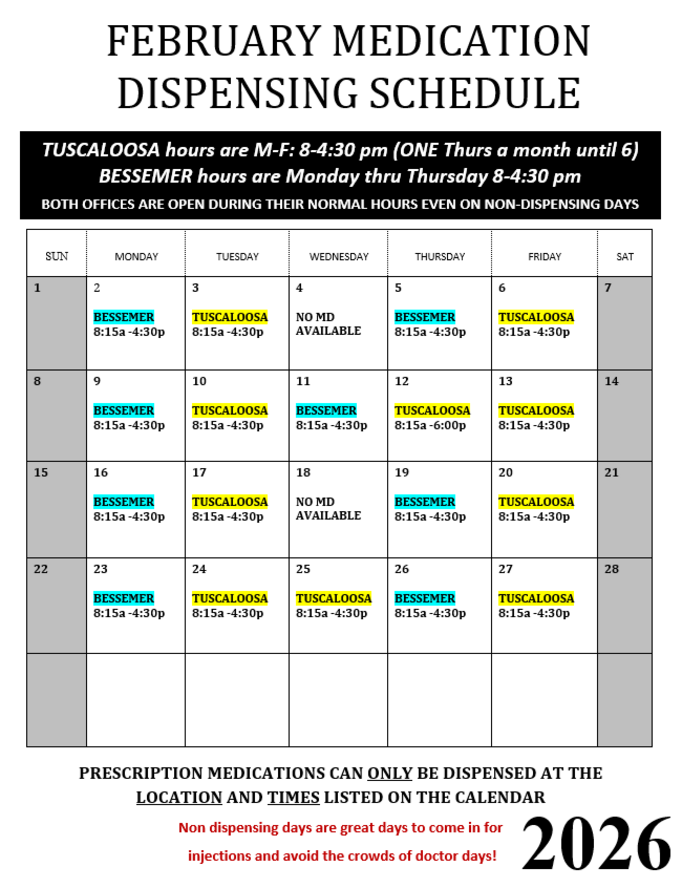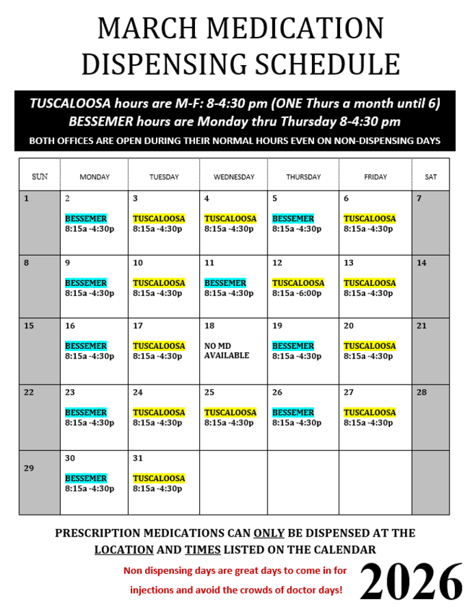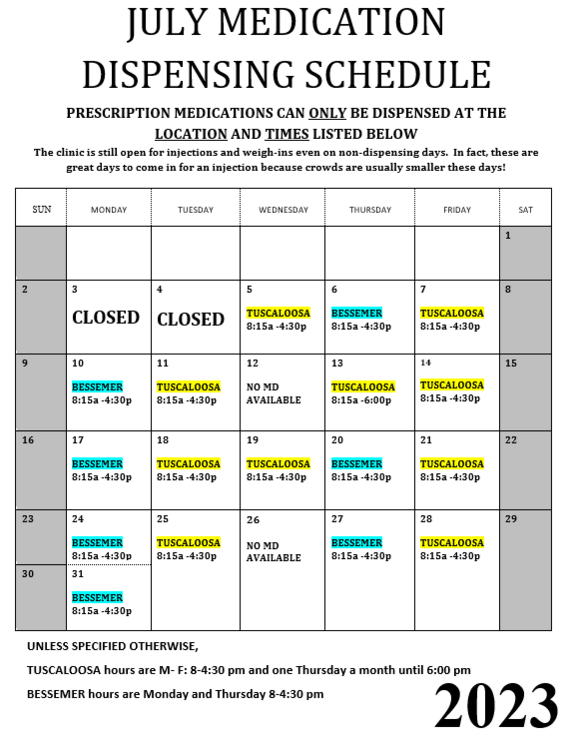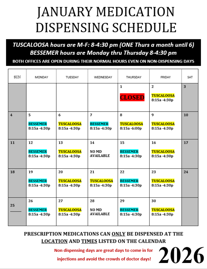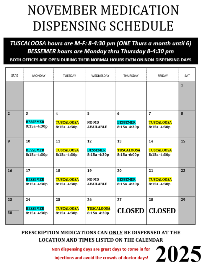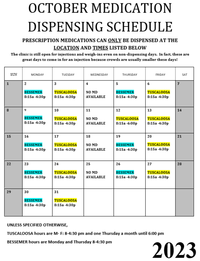Normal office hours are listed at the top of each calendar and are not effected by medication dispensing schedule.